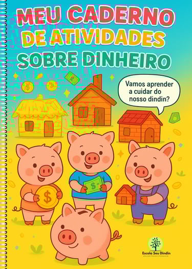 Para estender esse aprendizado ao lar, criamos o Caderno de Atividades Seu Dindin — um material exclusivo que convida pais e filhos a aprenderem juntos sobre dinheiro de forma divertida e significativa, por meio de histórias e desafios inspirados no cotidiano das crianças.